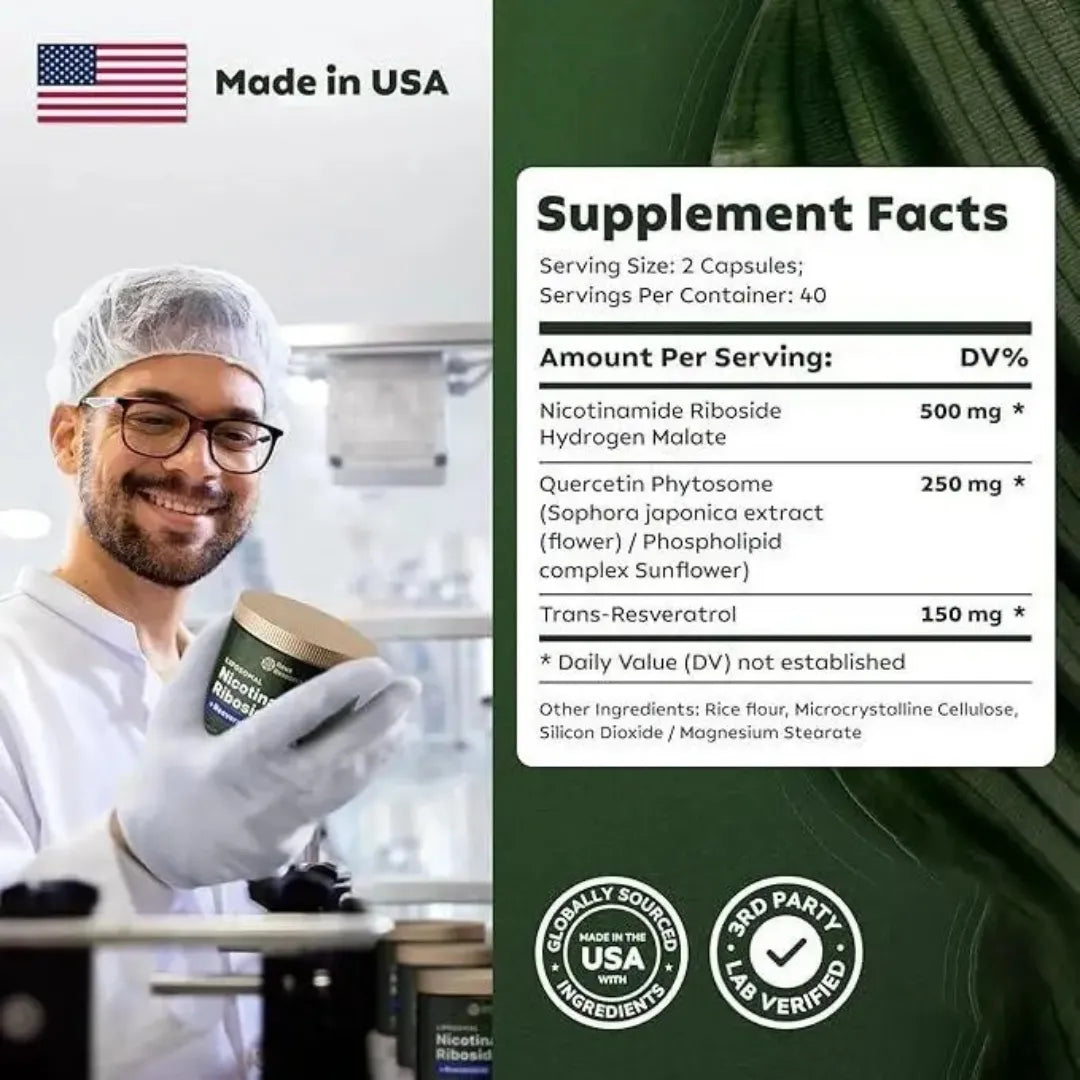 Cada cápsula contiene una dosis balanceada de NAD+ y resveratrol para apoyar tu cuerpo desde lo más profundo.